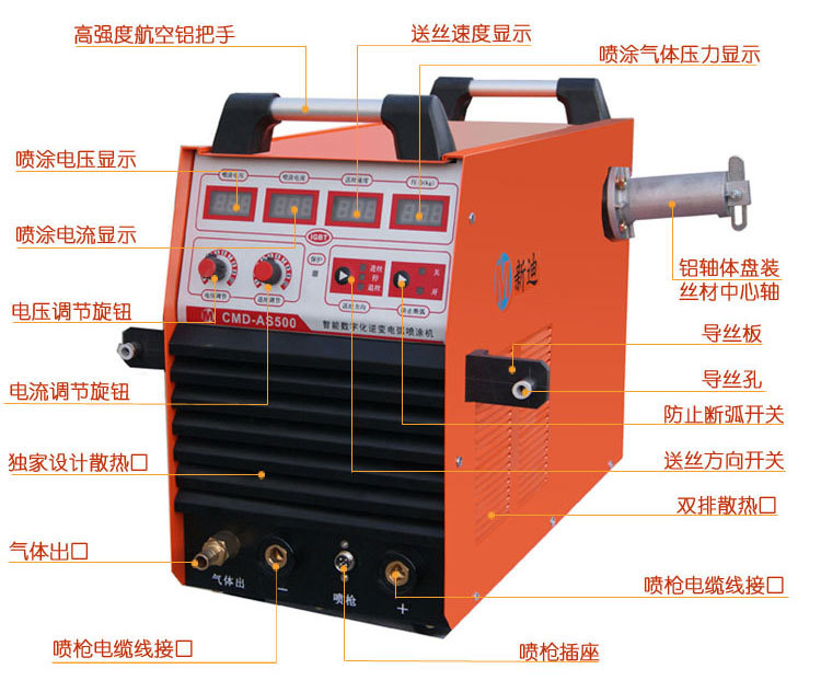 电弧喷涂一般相对较简单,包含喷枪、送丝机构和电源等几个组成部分。可用于大面积防腐、锅炉四管、零件维修等场合,可喷涂Φ1.0-3.0(mm)的丝材,可以喷锌、喷铝、喷不锈钢、喷硬铬、喷钼、喷铜、喷镍,喷镍铬合金等。即适合于做大面积防腐工程、也适合机械零部件恢复尺寸和修复、快速喷制各种模具、耐磨涂层、及制作装饰涂层等。电弧设备易损件只有导丝嘴和送丝轮,其维护和更换方便。
